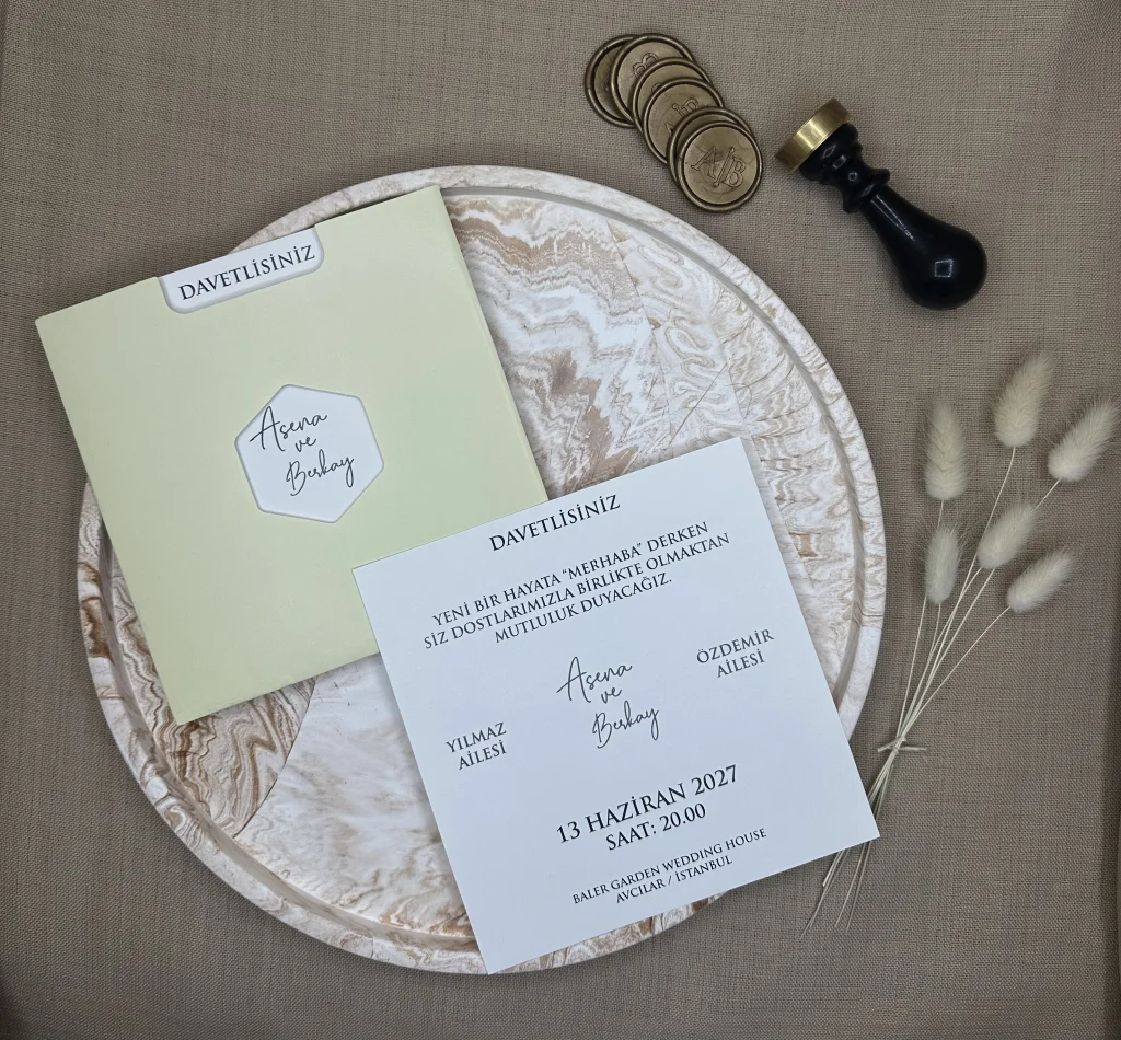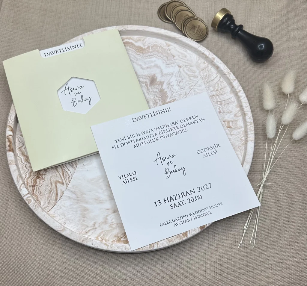 Davetiye ürün görselinde ve üzerinde varsa zarf, ip ve aksesuar fiyata dahildir.
