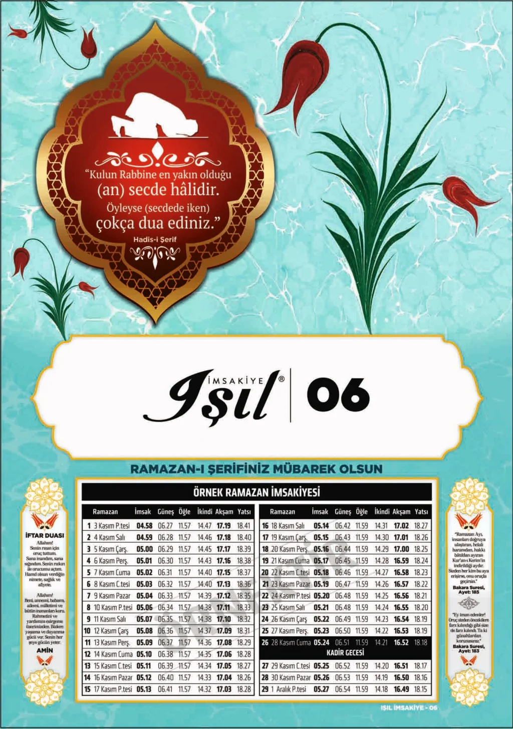 Tekirdağ İmsakiye Süleymanpaşa ilçesi için BRC Matbaa tarafından özel olarak tasarlanmıştır.